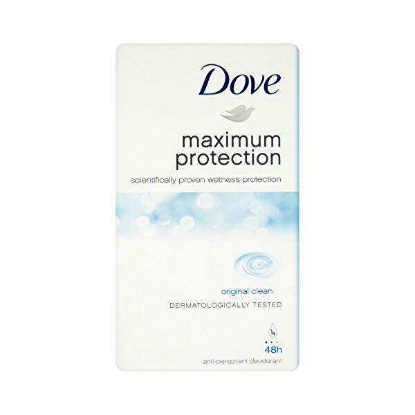 Zatím nejvyšší možná ochrana od Dove. Síla, kterou potřebujte v kombinaci s krásou a péčí očekávanou od Dove. Poskytuje vědecky prokázanou ochranu proti pocení a pečuje o pokožku díky1/4 hydratačního krému. Pro koho je určený Dove Maximum Protection? Pro ženy, které hledají maximální ochranu proti pocení a zároveň péči o pokožku v podpaží. Vlastnosti: