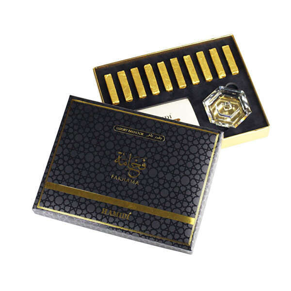 luxusní bakhoor Fakhama Oud obsahuje 10 ks vonných tyčinek a krásný křišťálový podstavec. Svrchní tóny jsou ovocné a kořenité, srdce je dřevitě-květinové a základní tóny jsou jantarově-sladké.