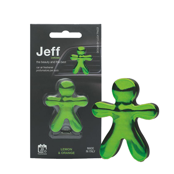 Panáček Jeff chrome Lemon & Orange obsahuje speciální esenciální oleje, které provoní váš vůz po dobu až 3 měsíců. Bojuje s nepříjemnými pachy, jako je například kouř z cigaret a příjemně osvěží vzduch. Neobsahuje alkohol. Panáčka stačí zasunout do ventilátoru auta díky úchytu, který má na zádech.