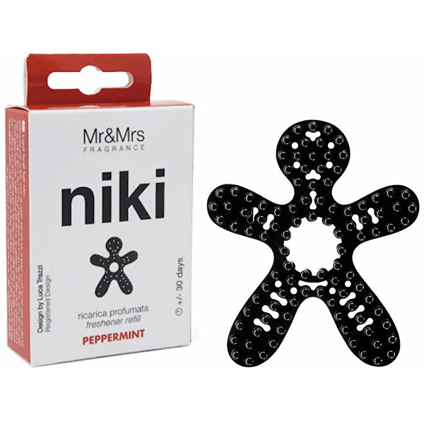 Panáček Niki big Pepper Mint obsahuje speciální esenciální oleje, které provoní váš vůz po dobu až 3 měsíců. Bojuje s nepříjemnými pachy, jako je například kouř z cigaret a příjemně osvěží vzduch. Neobsahuje alkohol. Panáčka stačí zasunout do ventilátoru auta díky úchytu, který má na zádech.