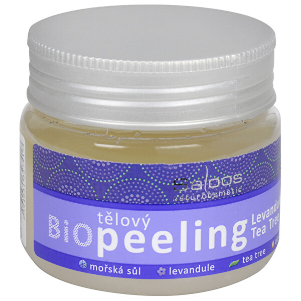 Bio Tělový peeling Levandule – Tea tree představuje zklidňující směs esenciálních olejů levandule a tea tree, mořské soli a rostlinných bio olejů pro zjemnění a zvláčnění celého těla, hrubých míst loktů, kolen a pat. Pokožku zbavuje odumřelých buněk a napomáhá její detoxikaci, dlouhodobě provoní a pozitivně vás naladí.