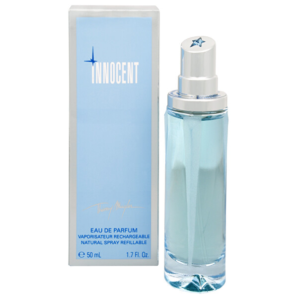 Thierry Mugler velebí vůni Innocent skleněným flakonem, který snoubí kontrasty v překvapivé hře světla a stínů. Vůně Innocent zůstává nezměněná a od nynějška plně uplatňuje svůj statut parfému. Živá, vždy jiskřivá a vždy také gurmánská vůně. Její měkounký závoj nás okamžitě zahalí úžasným vzdušným oparem, který zatoužíme znovu a znovu obnovovat. Nejprve je to jiskřivý obláček, ve kterém se prolíná lehce kyselá chuť bonbónů s chutí ovocné marmelády. Pak následuje obláček gurmánský a my cítíme vůni cukroví, jemnost pralinek a rozplývající se dražé.